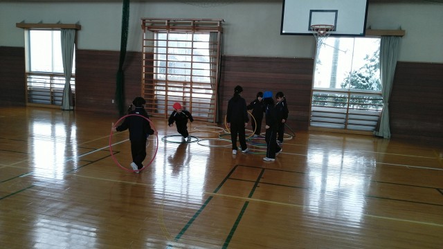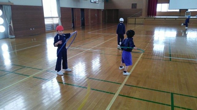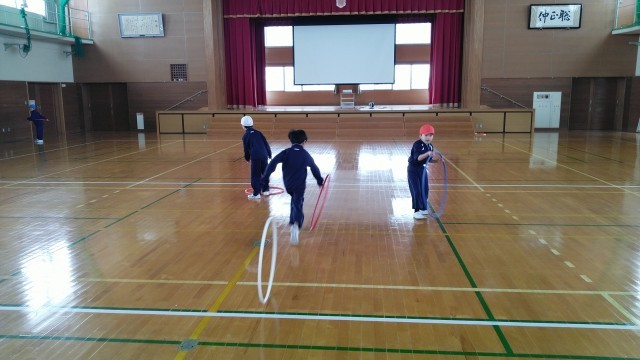 1年生の3時間目は、体育科の学習でした。体育館でフラフープを使って活動していました。