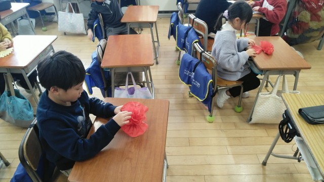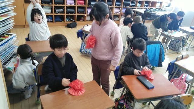 2年生は、5時間目に作業を終えた人から掲示に使う「お花」をつくっていました。大切な1つになるようにと、丁寧につくっていました。すばらしい。