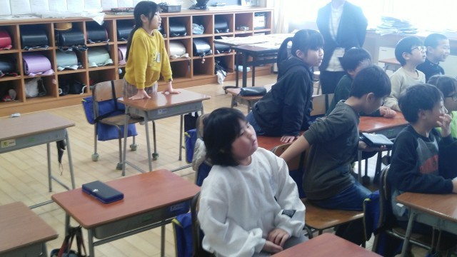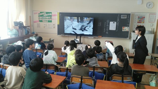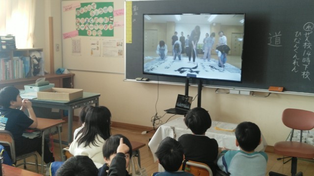 2年生は、5時間目に本校の「道クラブ」の書道パフォーマンスの動画を見ていました。食い入るように見ていました。