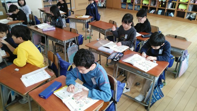 1年生の3時間目は、算数科の学習でした。時計の読み方の練習をしていました。