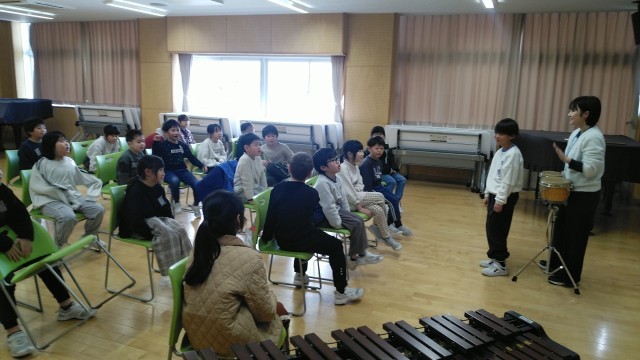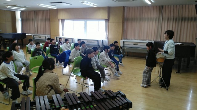 2年生の3時間目は、音楽科の学習でした。先生のたたくボンゴにあわせてのりのりに言葉を言っていました。