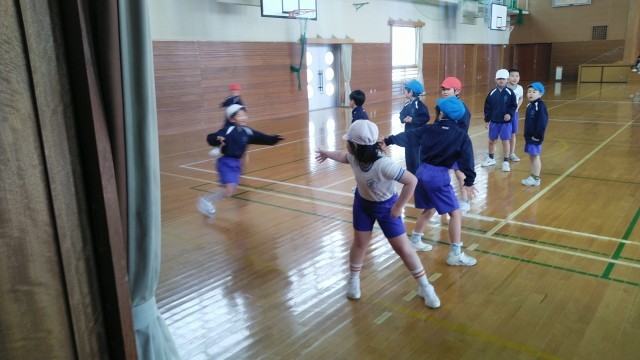 2年生の4時間目は、体育科の学習でした。順番を相談したあと、リレーの試合をしていました。