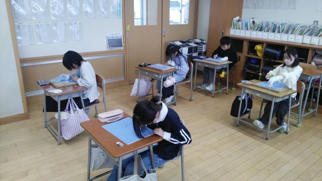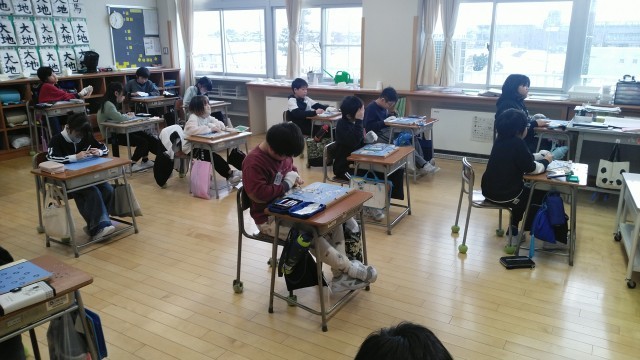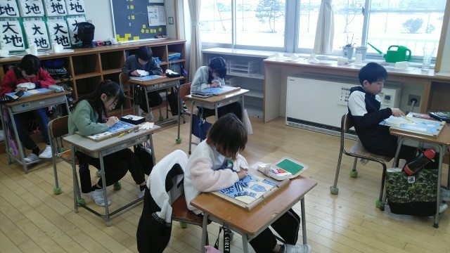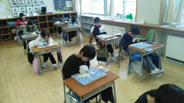 4年1組の4時間目は、図画工作科の学習でした。彩色版画の木版を彫っていました。