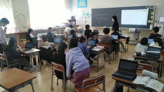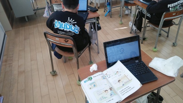 4年1組の5時間目は、外国語活動の時間でした。「歯を磨く」「顔を洗う」等の1日スケジュールを英語で考えていました。