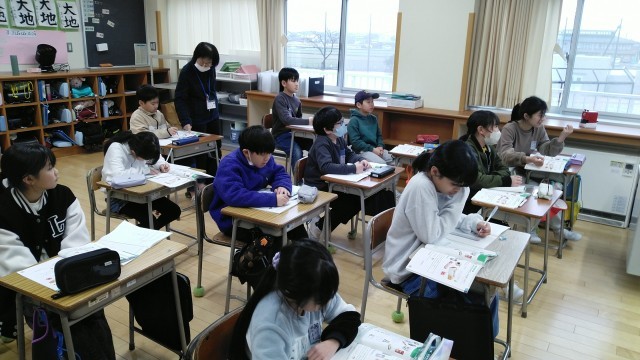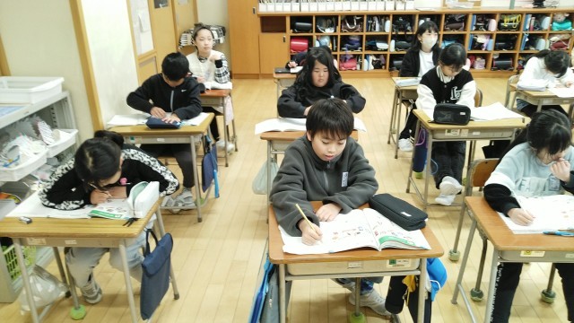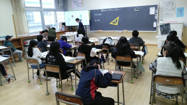 4年2組の3時間目は、算数科の学習でした。「立体」の学習で、いろいろな箱の仲間わけを考えていました。