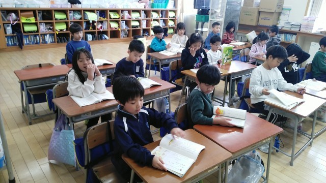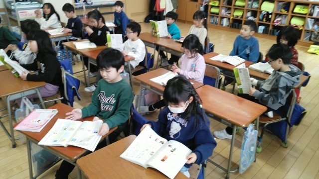 1年生の5時間目は、国語科の学習でした。「ずっとずっと大すきだよ」の範読を聞くところでした。