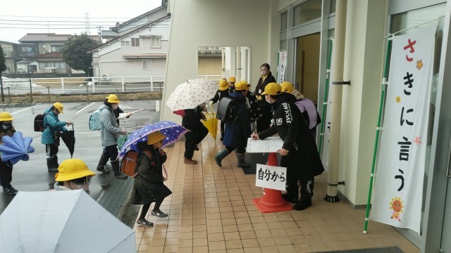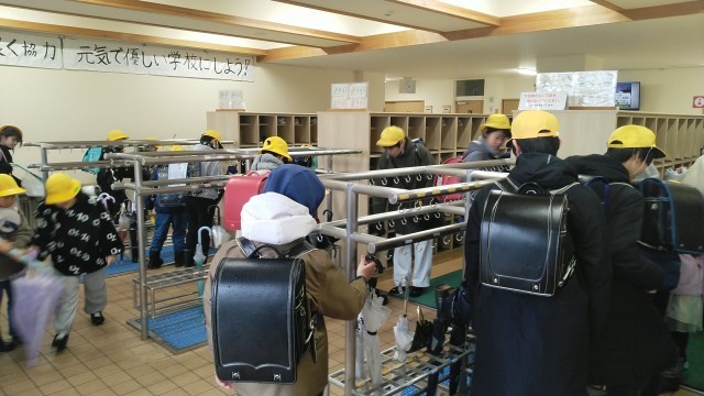 今朝の児童玄関の様子です。雨の朝です。ちょっぴり寒い朝ですが、子供たちの挨拶は元気です。