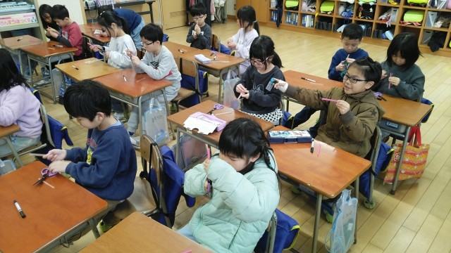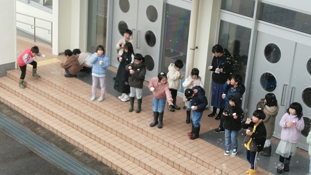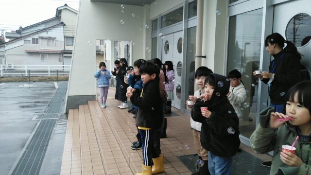 1年生教室を3時間目に覗くと、ストローをハサミで切っていました。そのあと液体の入った紙コップが配られ、児童玄関前に移動して…。シャボン玉でした。きれいなシャボン玉がたくさんできていました。