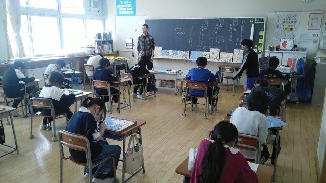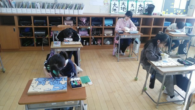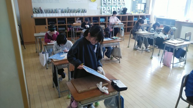 4年1組の3時間目は、図画工作科の学習でした。版画の版がだいぶん彫りあがってきたみたいです。