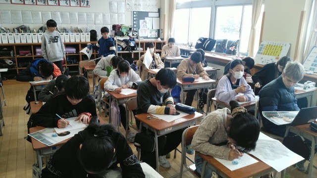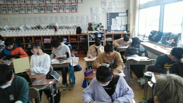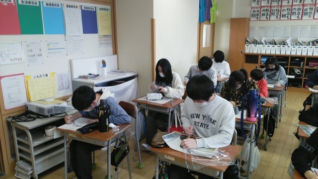 6年生の2時間目は、図画工作科の学習でした。写真を使って、自分の顔を色紙に写し取っていました。