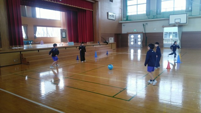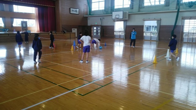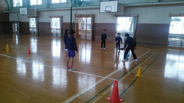 3年生の4時間目は、体育科の学習でした。体育館でフロアーボールの練習を団ごとにしていました。