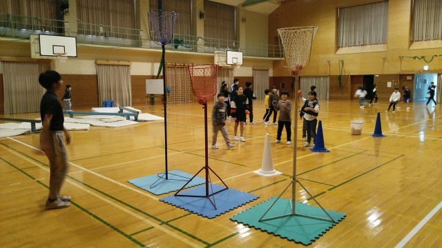 6年生卒業プロジェクト(ファミリーオリエンテーリング)の「だるまさんが転んだ」と「玉入れ」と「アスレチック」の様子です。体育館で行われていました。