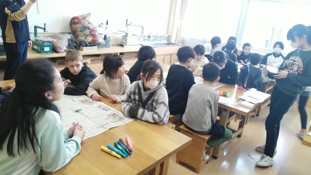図工室で行われていた「文字見付け」です。新聞の中から指定された文字「ありがとう」を見付けるゲームです。