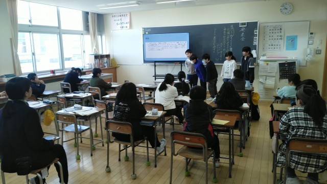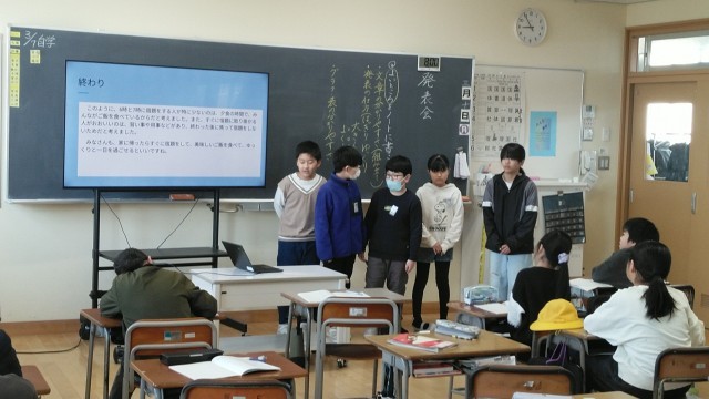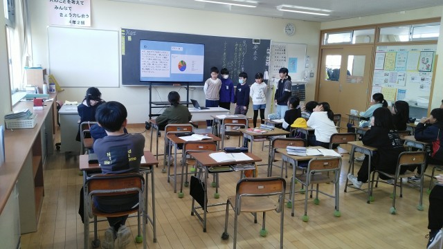 4年2組の1時間目は、国語科の学習でした。アンケートをとってまとめたことをグループごとに発表していました。