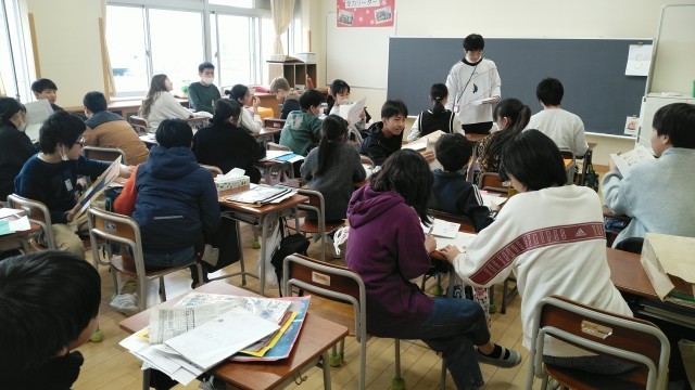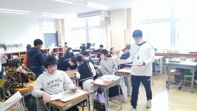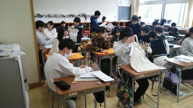 6年生の5時間目は、いろいろなものが配付されていました。これまでにかいたり、つくったりした絵やファイル等が配られていました。