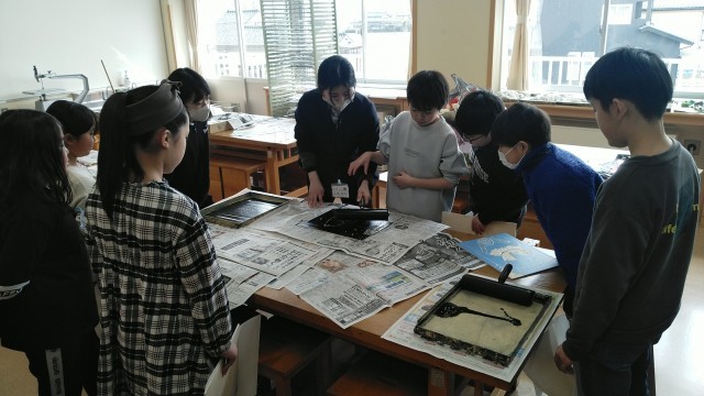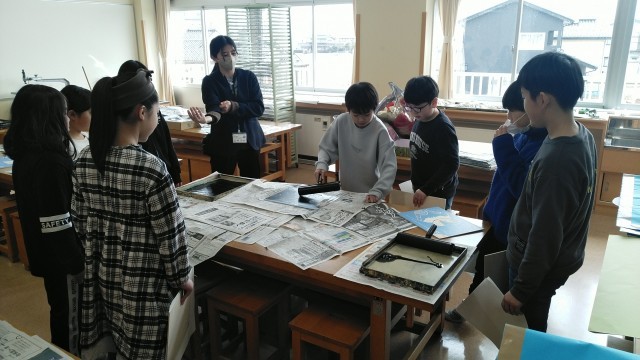 4年2組の3時間目は、図画工作科の学習でした。彩色版画の版にインクをつけて刷っていました。