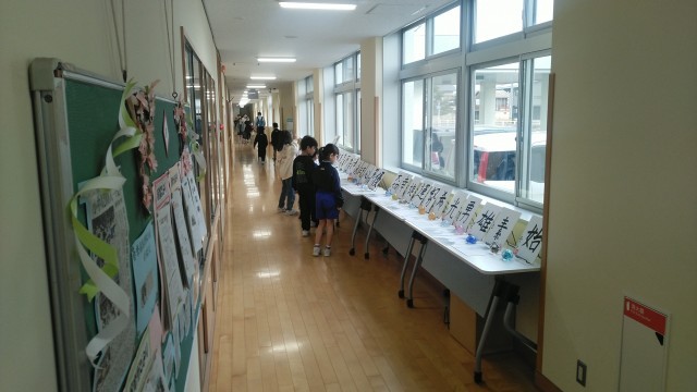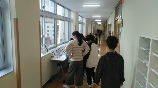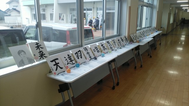 職員室前に6年生の作品が展示されていました。「一筆入魂」の作品と「超リアルな自画像をつくろう」の作品とガラス美術館でつくった作品です。たくさんの子供たちが立ち止まって見ていました。