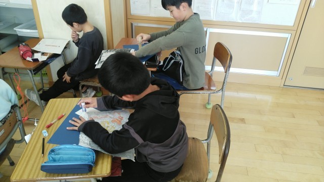 4年2組の5時間目は、図画工作科の学習でした。彩色版画が完成して作品票をかいている人がほとんどでした。