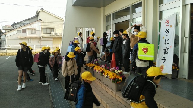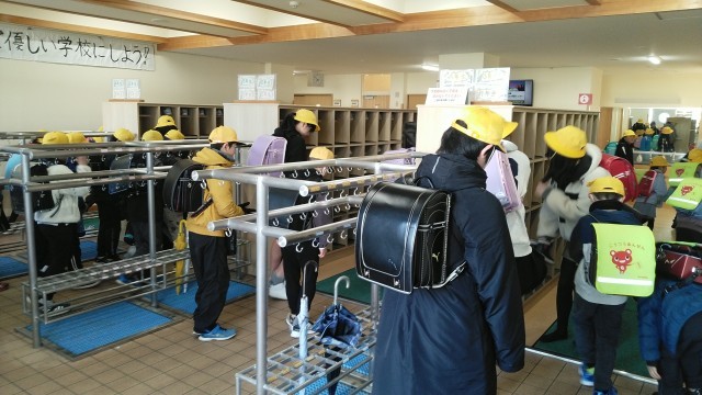 今朝の児童玄関の様子です。元気な子供たちの挨拶が飛び交っていました。
