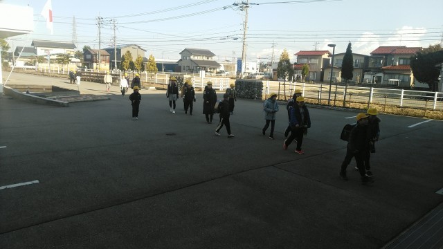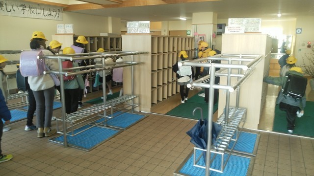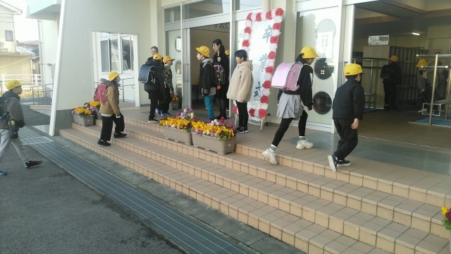 今朝の児童玄関の様子です。晴れました。1~5年生の子供たちが元気に登校してきました。挨拶も元気です。