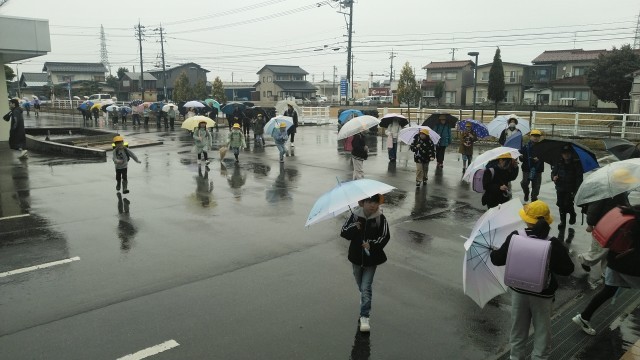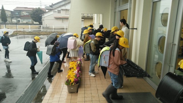 今朝の児童玄関の様子です。雨の日の朝です。今日から6年生が来なくなるので空も悲しんでいるのかも…。