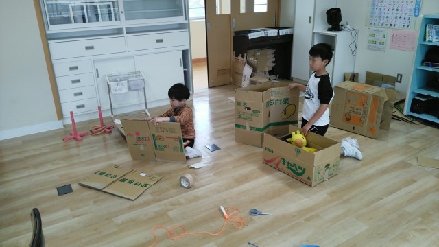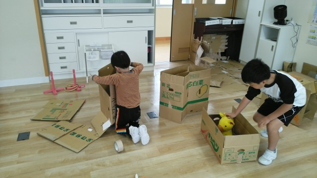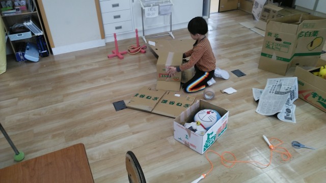 つばめ野級2組は、1時間目に段ボールハウスをつくっていました。ドラちゃんとキリンちゃんのハウスをつくっているそうです。
