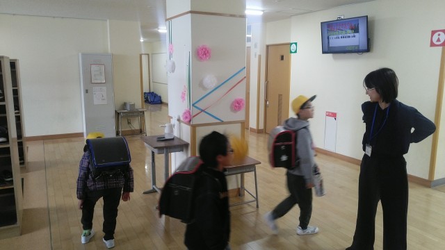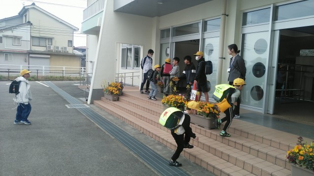 今朝の児童玄関の様子です。ちょっぴり風の強い朝です。子供たちは、元気に登校してきました。