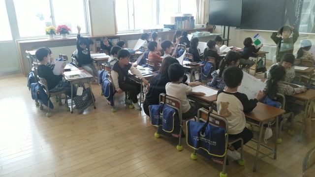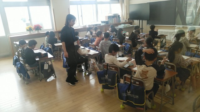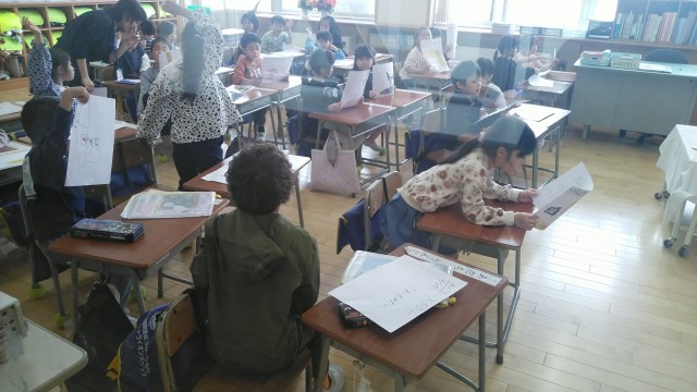1年生の5時間目は、準備の時間でした。学校探検でインタビューしたりする準備をしていました。