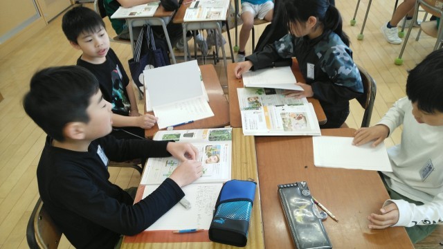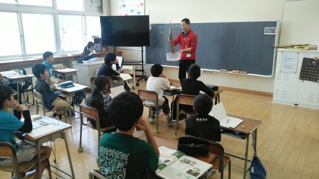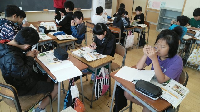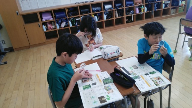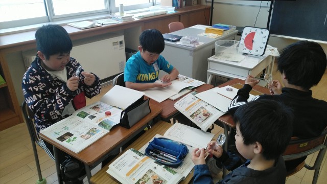 4年生の2時間目は、理科の学習でした。へちまの種をもらって、虫メガネで観察していました。
