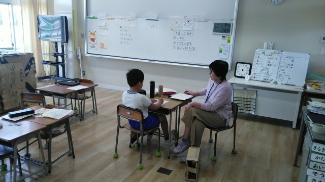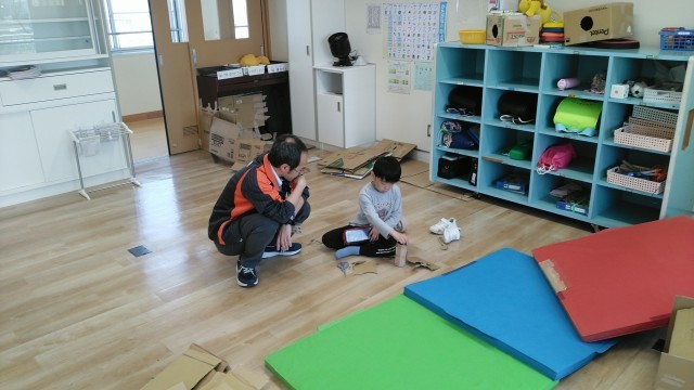 つばめ野級2組の3時間目は、それぞれの活動を進めていました。段ボールでペンたてをつくったり、算数のプリントを進めたりしていました。