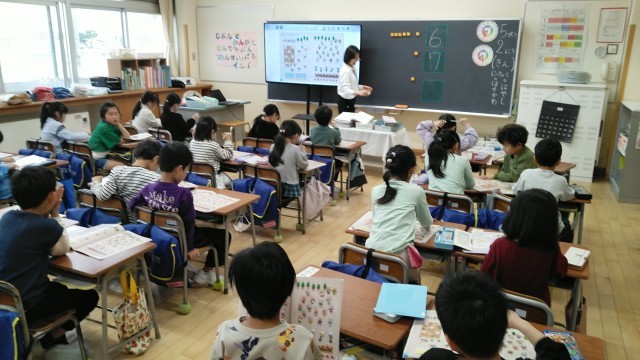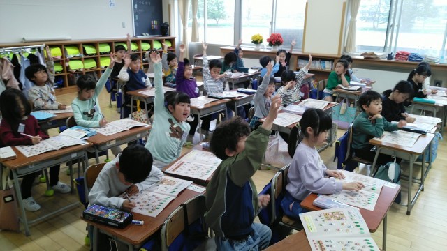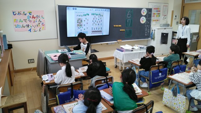 1年生の1時間目は、算数科の学習でした。教科書の絵の中から「8」あるものを探していました。