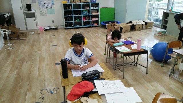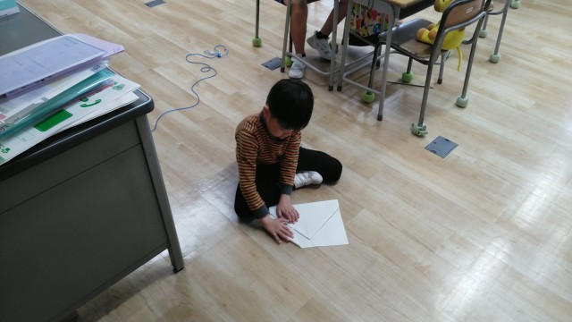 つばめ野級2組の1時間目は、それぞれが自分の活動を進めていました。飛行機をつくったり、絵を描いたり、算数のプリントをしたりなど、進めていました。