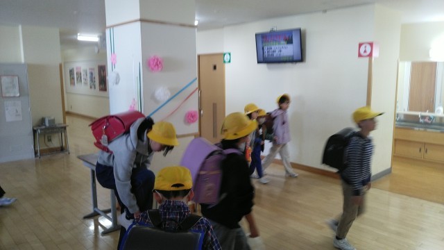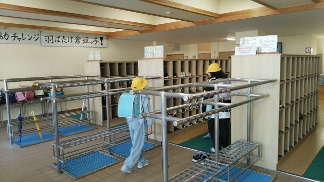 今朝の児童玄関の様子です。晴れの日の気持ちのよい朝です。子供たちの挨拶も元気です。