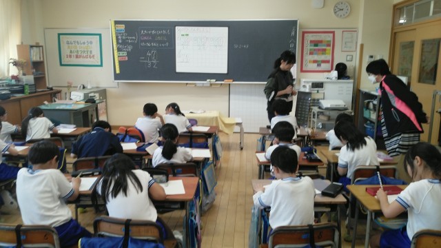 2年生の2時間目は、算数科の学習でした。76-33のひっ算の仕方を考えていました。