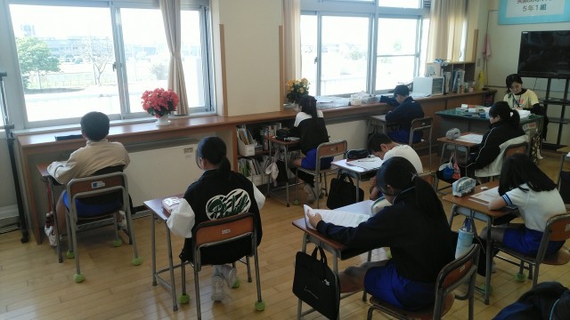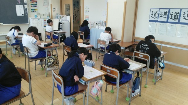 5年1組の2時間目は、国語科の学習でした。「銀色の裏地」のテストをしていました。
