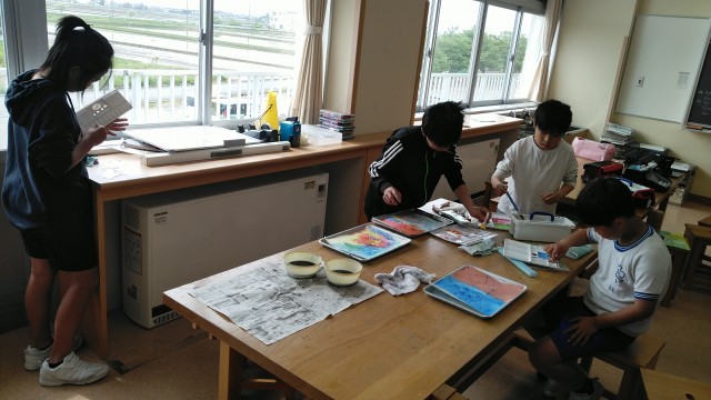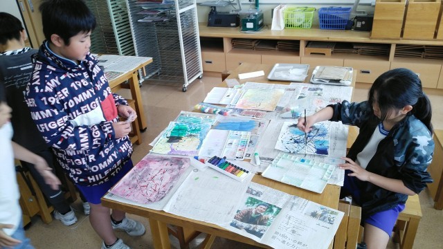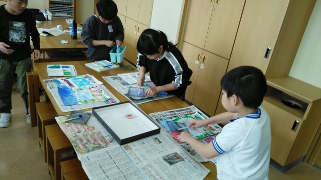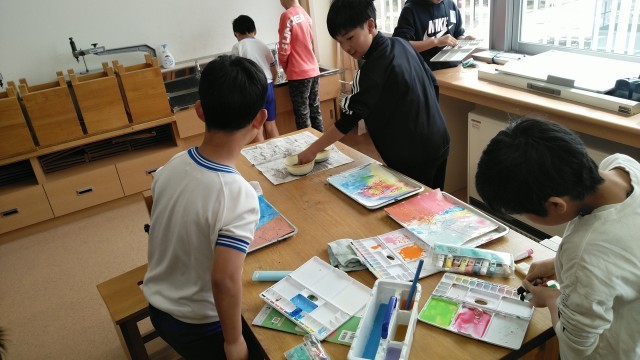 4年生の1時間目は、図画工作科の学習でした。スパッタリングやビー玉を転がして色をつける等、いろいろな表現方法を試して楽しんでいました。