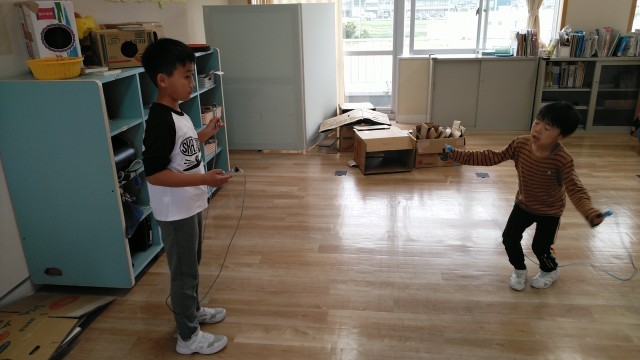 つばめ野級2組では、1時間目になわとびを見せてくれました。二重跳びを見せてくれました。落とした色鉛筆を自分できれいに並べてもいました。
