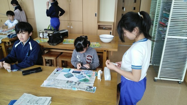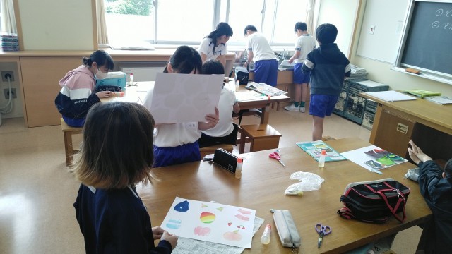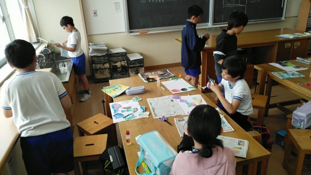 5年2組の3時間目は、図画工作科の学習でした。いくつか表現した心を再構成して「心のもよう」を完成させていました。