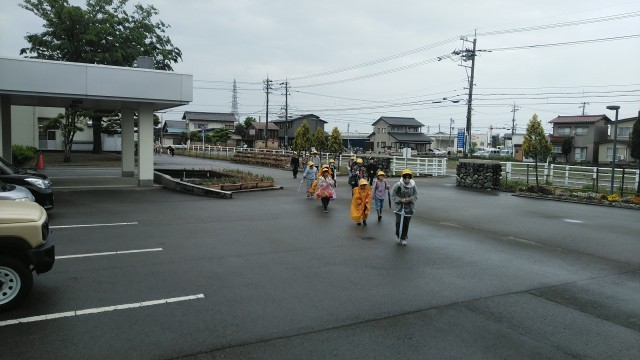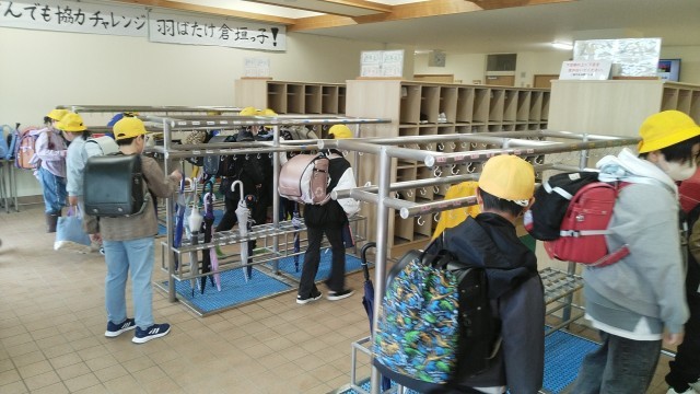 今朝の児童玄関の様子です。曇り空の朝です。子供たちは、元気に登校してきました。
