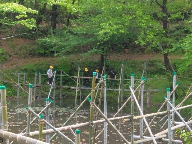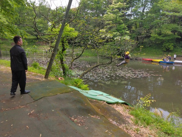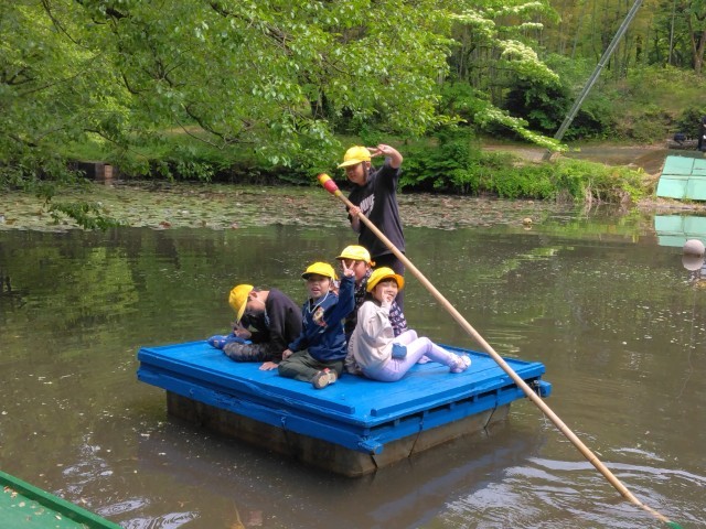 午後の活動が始まりました。ターザンロープ、いかだ、池ジャングルです。