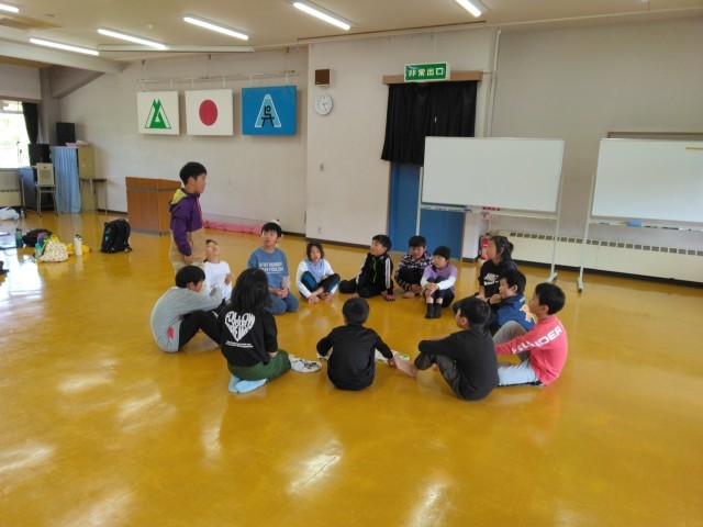 屋外での活動を終え、クラスみんなで振り返りをしました。楽しかったこと、学んだこと、友達の素敵なところ等を、一人一人発表しました。
