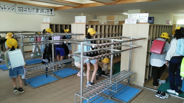 今朝の児童玄関の様子です。晴れた気持ちのよい朝です。子供たちの挨拶も元気です。