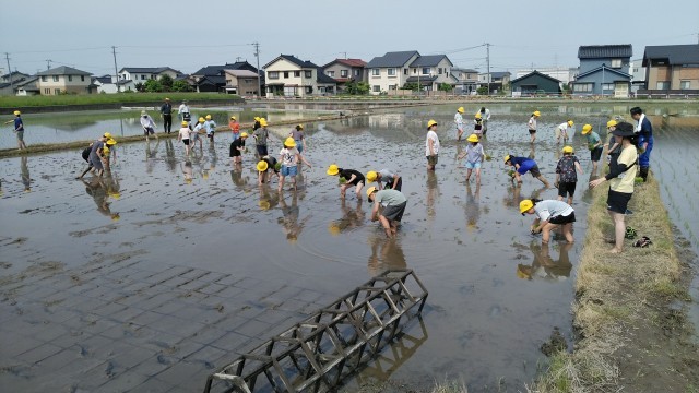 5年生が田植え体験をしている田んぼに行ってみました。「ころがし」を使ってみたあと、苗を植え始めたそうです。半分以上植え終わったところでした。ぬるぬるする田んぼの感触を足で味わいながら楽しそうに植えていました。布目生産組合の皆様、農協の皆様、ありがとうございました。
