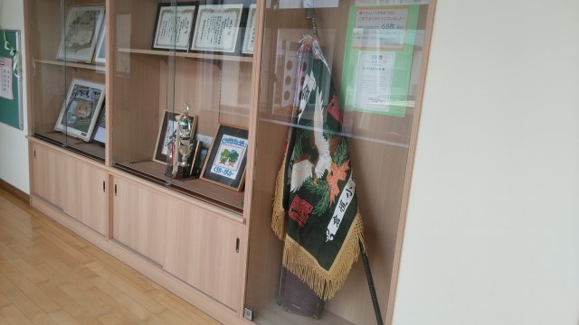 職員室前のショーケースに運動会の優勝旗が飾られています。どの団が勝ち取るか楽しみですね。