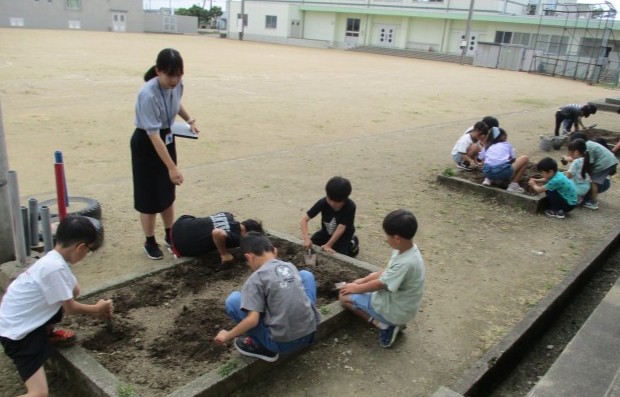 2年生の1時間目は、生活科の学習でした。野菜の苗を植える準備をしていました。