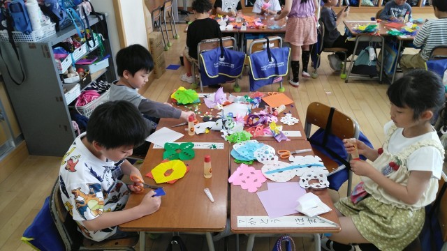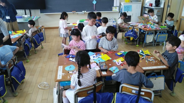 1年生の2時間目は、図画工作科の学習でした。「ちょき ちょき かざり」をつくっていました。