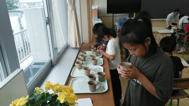 4年生の5時間目は、理科の学習でした。プリント直しをやって、終わった人からへちまの種の観察をしていました。