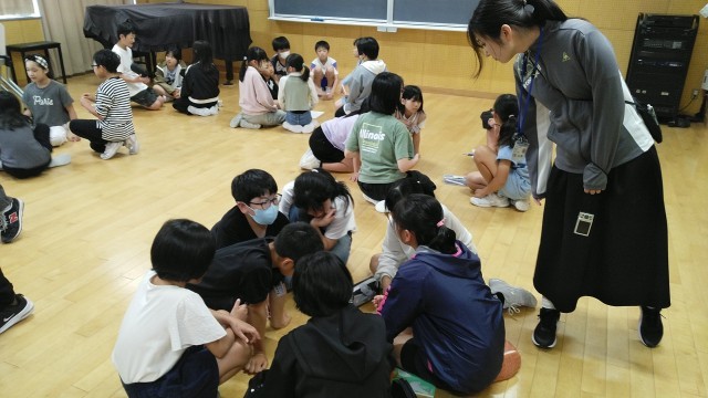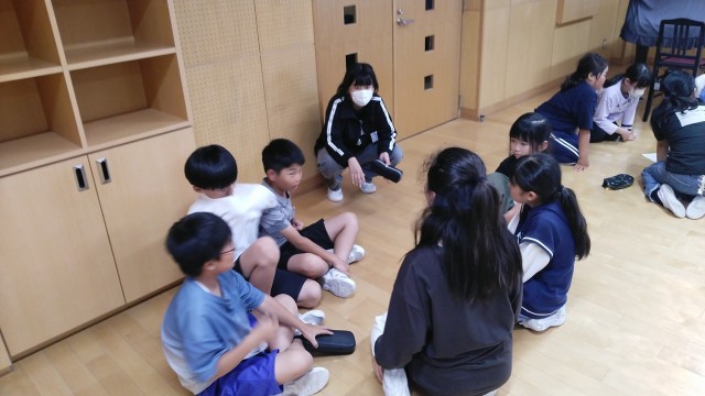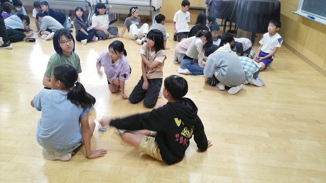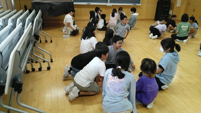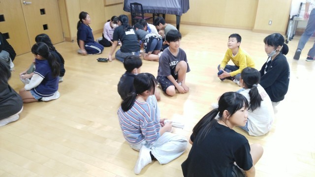 5時間目に5・6年生は、音楽室に集まっていました。宿泊学習に向けて、班で集まって係の話をしていました。