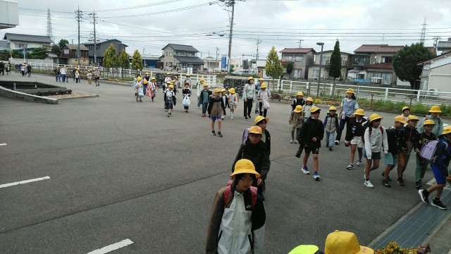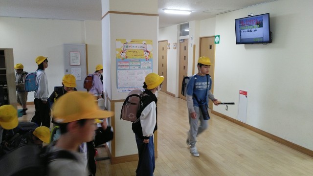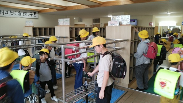 今朝の児童玄関の様子です。曇り空の朝です。子供たちが元気に登校してきました。