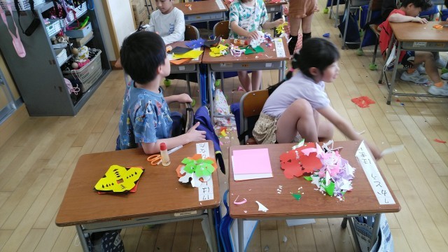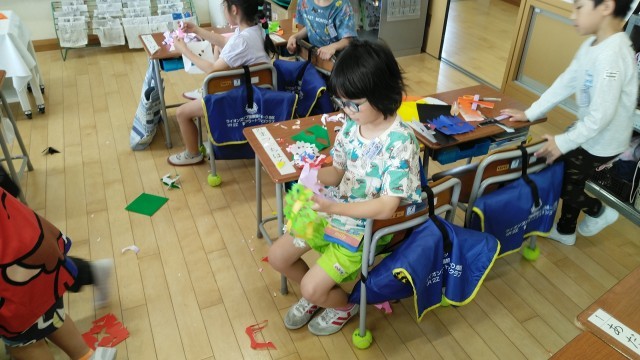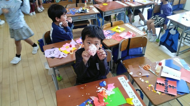 1年生の4時間目は、図画工作科の学習でした。ちょきちょきかざりをつくっていました。